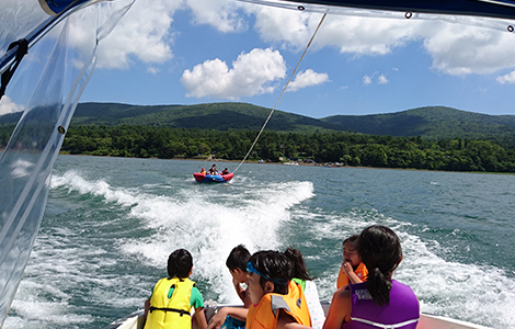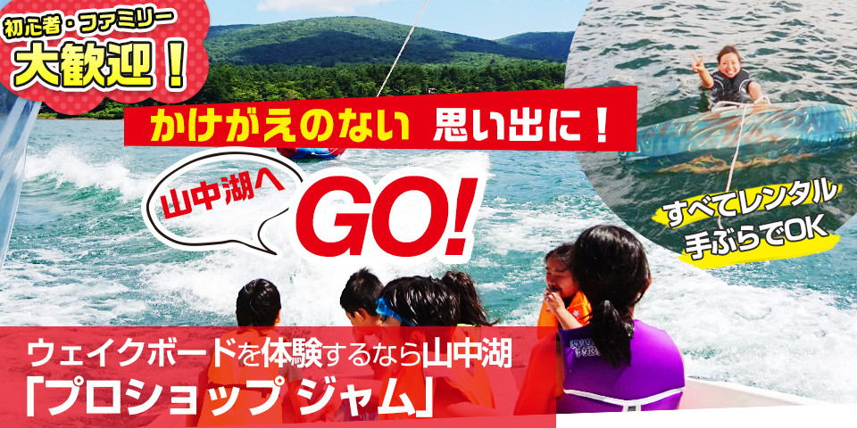 ボートに引っ張られながら走る水しぶきや景色の爽快感!そのスピード!自分自身が風を切っているような感覚は他のスポーツでは なかなか味わえません。上手く立てるようになるだけでもかなりの楽しみを体感することができますが、上達をすればするほど見えて くる楽しさもたくさんあります。初めて宙を舞う感覚、波を利用する直感、などの体感する魅力もさることながら他の人のトリックを 見る美しさや刺激は他のスポーツでは味わえないほど虜になります! ぜひ山中湖にお越しの際はウェイクボードを体験してみてはいかがでしょうか